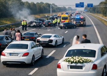 Een uitbundige trouwstoet van gehuurde luxeauto’s eindigde in een kettingbotsing op de snelweg, met flinke schade en geschrokken families als...