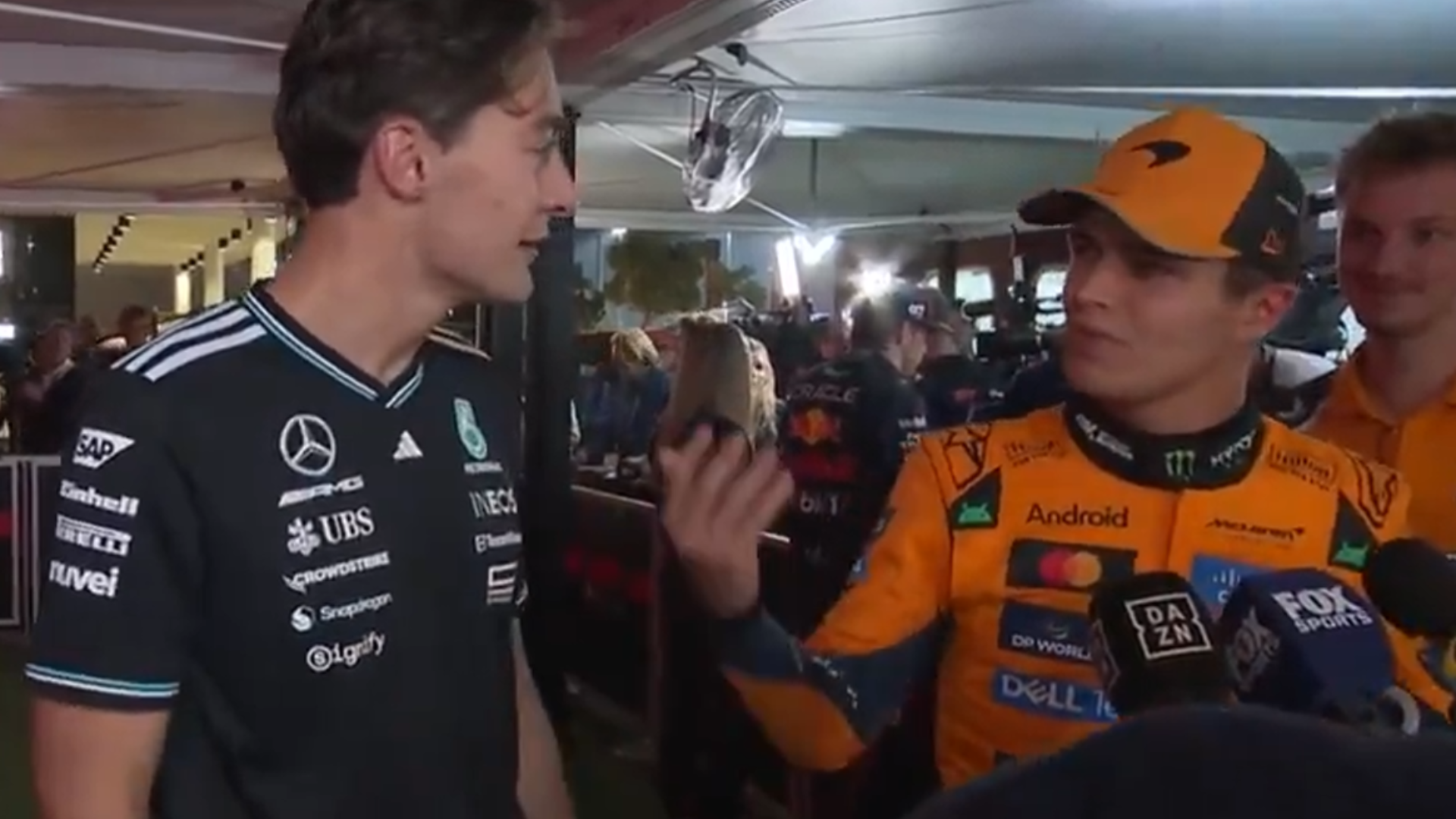 Het gesprek kreeg een bijtende ondertoon. Russell wierp tegen dat het ”klonk als iets wat jij zou zeggen”, terwijl Norris doorvroeg: waar zat je, liet je me erlangs? Russell pareerde dat hij juist een slipstream gaf ”om je te helpen het kampioenschap te winnen”. Dat werd met een glimlach gebracht, maar de subtekst was hard.