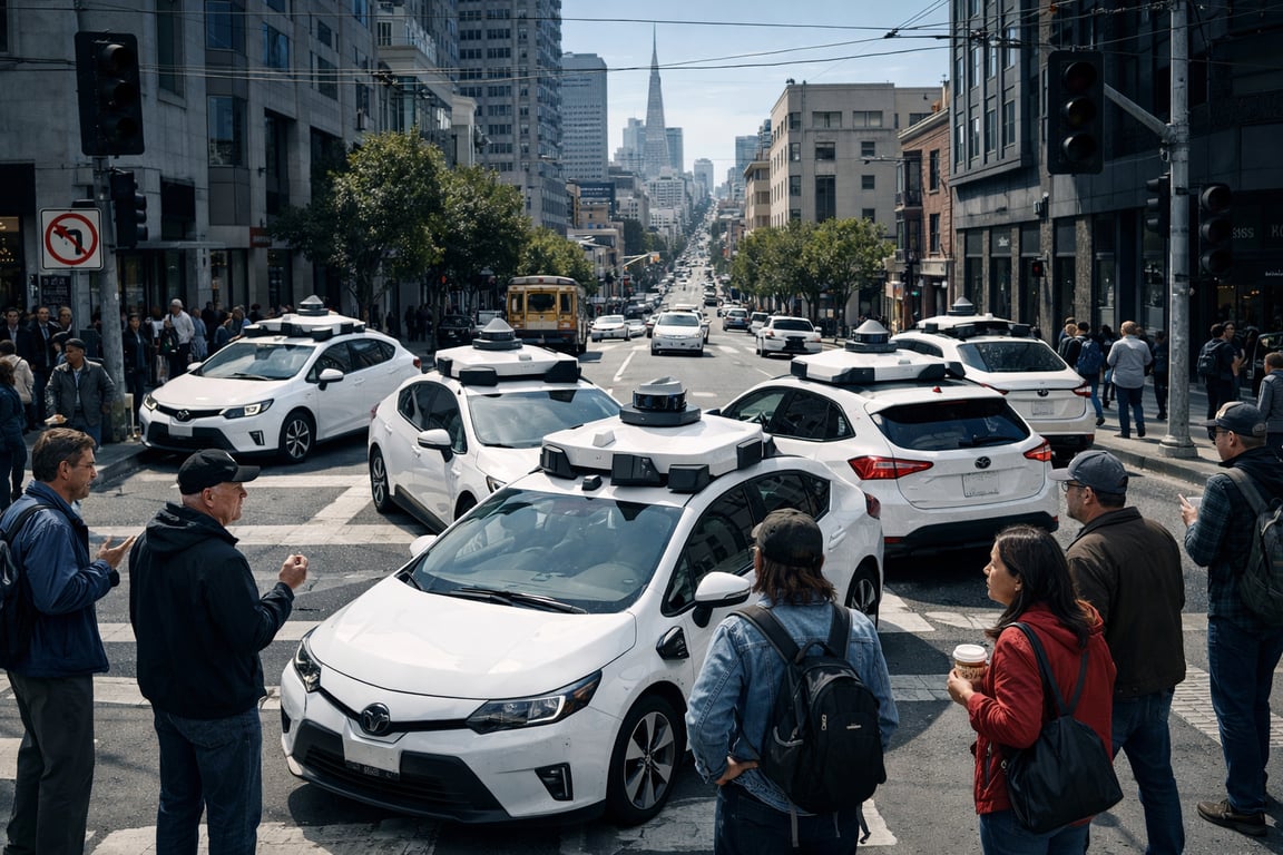 Dat gedrag is geen fout, maar een bewuste ontwerpkeuze. Autonome systemen programmeren vaak sterke veiligheidsmarges in; als sensoren of verkeersregels onduidelijk zijn, is veilig stoppen het minst risicovolle alternatief. Probleem is dat in echte steden zoals San Francisco die afweging vaak leidt tot blokkades en ergernis als meerdere voertuigen hetzelfde ‘veilige’ besluit nemen.